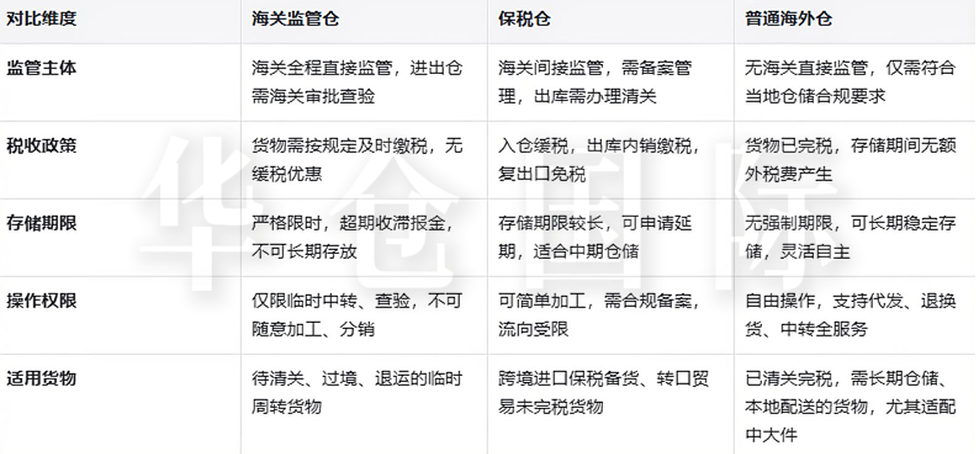 为方便商家快速对比区分,小华从监管主体、税收政策、存储期限、操作权限、适用货物五大核心维度,整理清晰差异对比,一张图帮你快速锁定适配仓储: