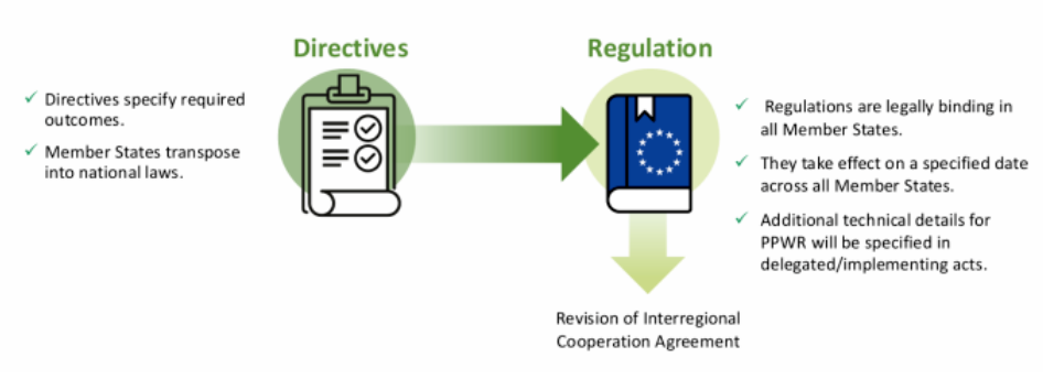 法律效力升级:旧指令需各成员国转化为本国法律,执行尺度不一;而PPWR作为“法规”,直接适用于所有欧盟成员国,具有统一强制性约束力,无需各国另行立法。