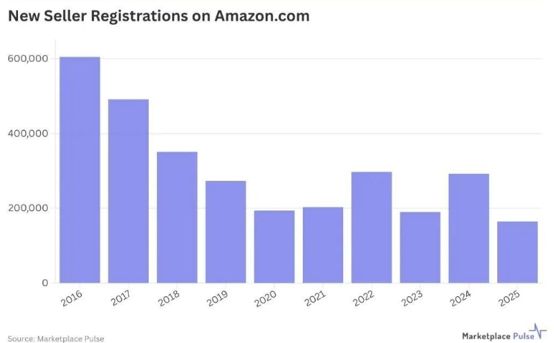 2025 年,跨境电商行业的核心风向标 —— 亚马逊平台,交出了一份极具转折意义的卖家数据:全球新注册卖家仅16.5 万名,较 2024 年的 25 万名同比暴跌44%,创下 Marketplace Pulse 自 2015 年统计以来十年最低值。